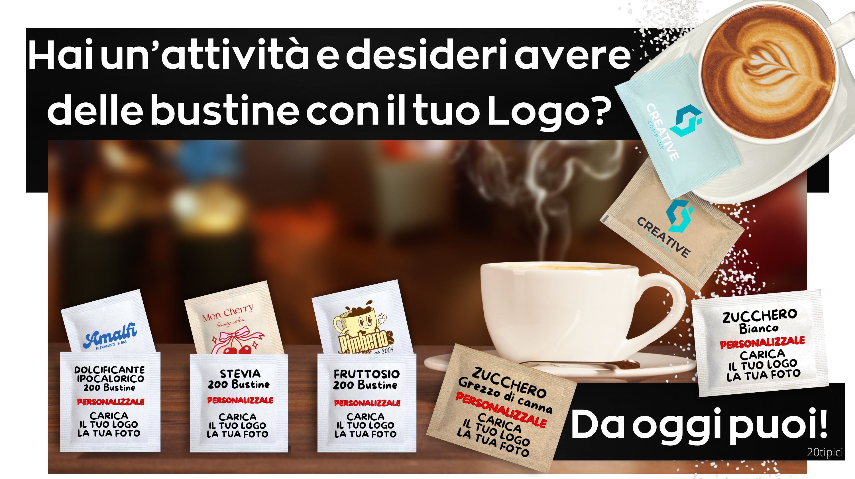 - ✉"20tipici" ti offre la possibilità di personalizzare le bustine di dolcificanti e zucchero con il tuo logo, il tuo messaggio.